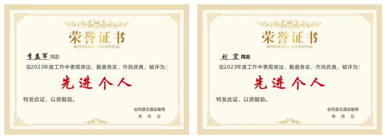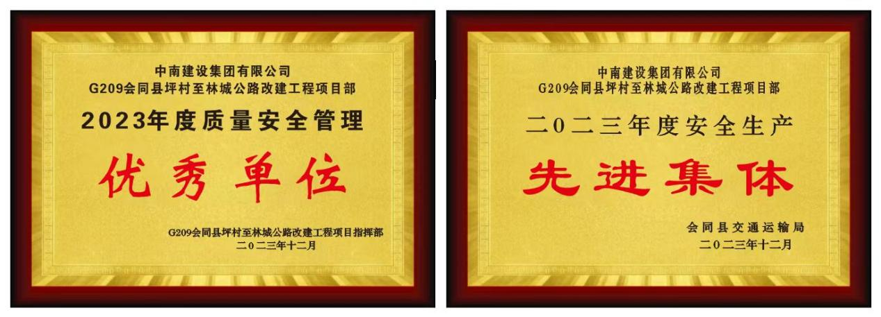 今年,集团公司承建的G209会同县坪村至林城公路改建工程喜获会同县发改委颁发的“2023年度清廉工程”奖、怀化市平安办颁发的“2023年度平安工地”、怀化市交通局颁发的“2023年度和谐工地”、会同县交通局颁发的“2023年度安全生产先进集体”等多项荣誉与奖项。