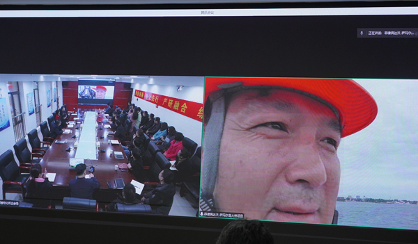 谈文胜一行率先抵达物化所,在座谈会现场,谈文胜与在菲律宾达沃-萨玛尔跨海大桥桩基项目部的工作人员进行视频连线,亲切交谈。